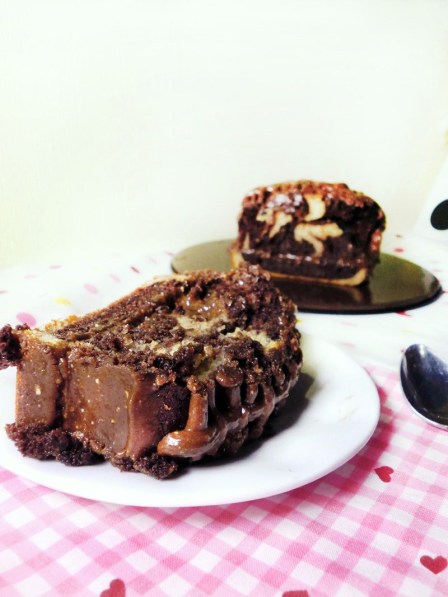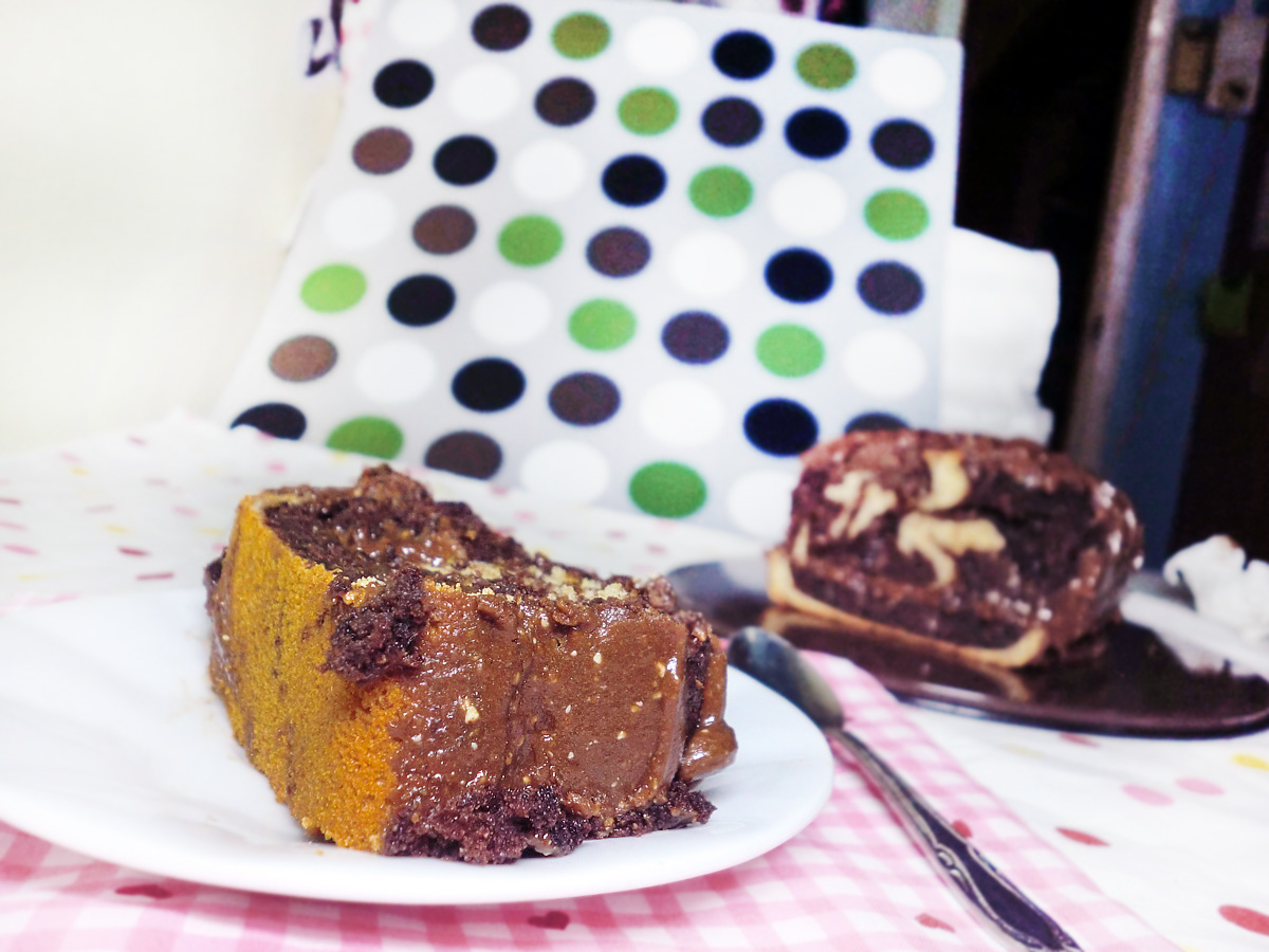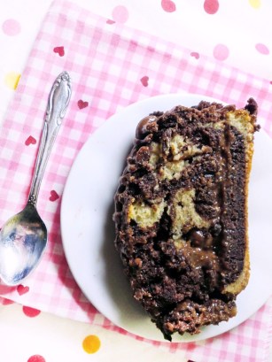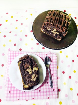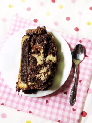 Use a large spoon to fill the bottom of the pan with about three quarters of the white batter placed in dollops. Cover the white batter with dollops of chocolate batter. Top the chocolate batter with small dollops of white batter spaced so that the chocolate batter shows through. Use a table knife to marble the batters together with a circular or zigzag motion; be careful not to blend them too much. Bake for 45-50 minutes or until the cake starts to pull away from the sides of the pan and a toothpick inserted in comes out clean.