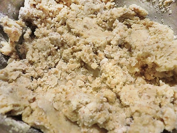 Sift together flour and icing sugar, add in ground and diced peanuts, mix well.