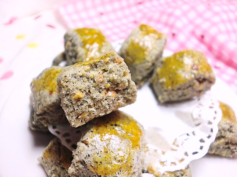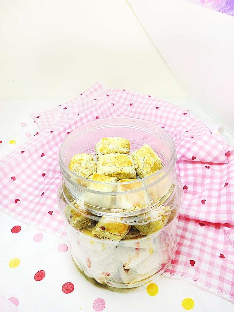Sift together flour and icing sugar, add in ground and diced peanuts, sesame powder and sesame. Mix well.