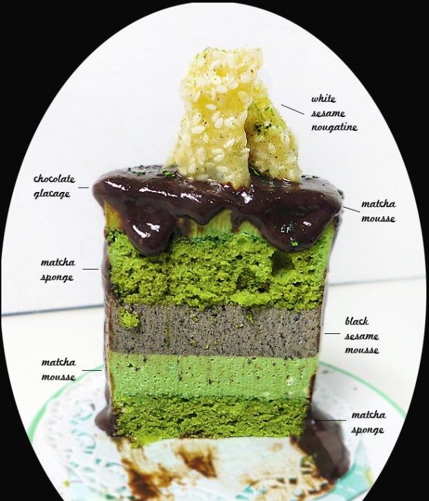 Black sesame mousse and white seame nougatine are adapted from: http://mushitza.blogspot.com/2011/01/matcha-black-sesame-entrement.html